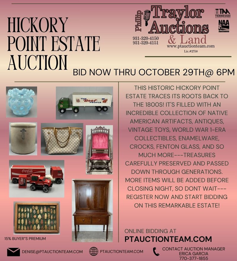 This historic Hickory Point Estate traces its roots back to the 1800s! It's filled with an incredible collection of Native American artifacts, antiques, vintage toys, World War 1-era collectibles, enamelware, crocks, Fenton Glass, and so much more---treasures carefully preserved and passed down through generations. More items will be added before closing night, so dont wait---register now and start bidding on this remarkable estate!