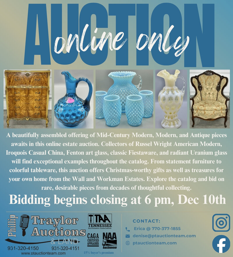 A beautifully assembled offering of Mid-Century Modern, Modern, and Antique pieces awaits in this online estate auction. Collectors of Russel Wright American Modern, Iroquois Casual China, Fenton art glass, classic Fiestaware, and radiant Uranium glass will find exceptional examples throughout the catalog. From statement furniture to colorful tableware, this auction offers Christmas-worthy gifts as well as treasures for your own home from the Wall and Workman Estates. Explore the catalog and bid on rare, desirable pieces from decades of thoughtful collecting.